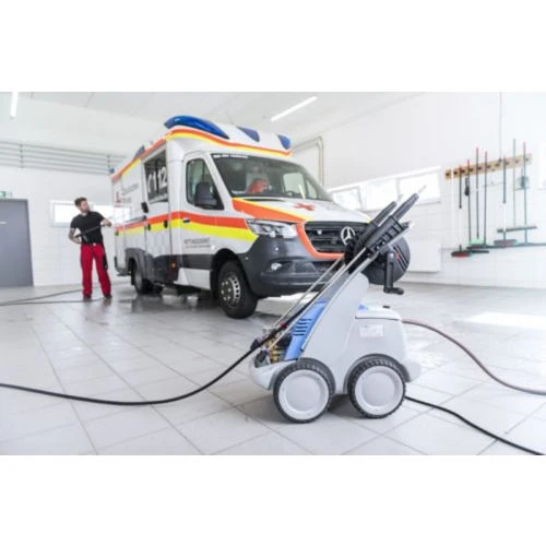 Le nettoyeur haute pression Quadro 599 TST 3300 W de Kränzle est doté d’un tambour-enrouleur intégré avec manivelle rabattable, d’un châssis avec roues tout-terrain de grand diamètre et d’un réservoir d’eau pour éviter l’endommagement de la pompe à haute pression en cas de manque d’eau.