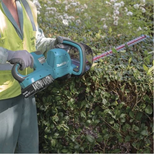 La taille-haie sans-fil DUH551RF2 36 V de Makita est une machine puissante, maniable et silencieuse, idéale pour les tailles précises. Elle bénéficie d’un très bon équilibre avec une poignée pivotante sur 5 positions possibles à 180 °, améliorant la maniabilité et le confort d’utilisation. Aussi, elle dispose d’un variateur de vitesse de coupe sur six positions, réglable en fonction du végétal à couper. Enfin, il est possible de monter un déflecteur sur l’outil permettant de récolter les chutes de taille.