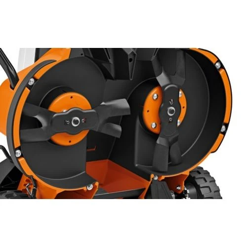 - Les roues frontales pivotent à 360° ce qui permet de tondre facilement autour des buissons et des arbres, mais aussi de tourner facilement. Cela rend cette tondeuse à gazon professionnelle à batterie Stihl encore plus maniable.
