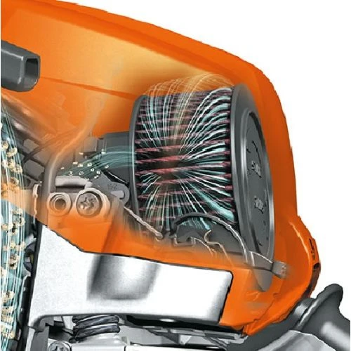 Le compensateur Stihl, intégré dans le carburateur, a pour effet de compenser l’encrassement progressif du filtre à air en stabilisant les gaz d’échappement et la consommation. Le filtre à air doit être nettoyé que lorsque l’on constate une baisse de puissance. Cela présente l’avantage que l’on peut atteindre de très longs intervalles de maintenance